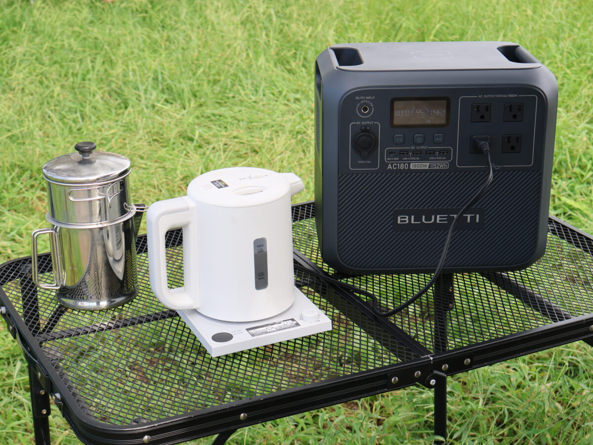 実際に使ってみて感じるのは、消費電力2700Wまでの家電に対応しているというのはかなりのアドバンテージだ。実は僕、前回のモトメガネの取材でAC60が気に入ってしまい購入したのだがAC60の出力は600W。電力リフトモードを使っても1200Wの家電までしか動かすことはできない。そのため、わざわざこの出力以下の電気ケトルを探して購入したりしたのだが、ブルーティAC180ならそんなことを気にすることがない。出力的には家にある大抵の家電がフィールドで使えてしまうのだ。