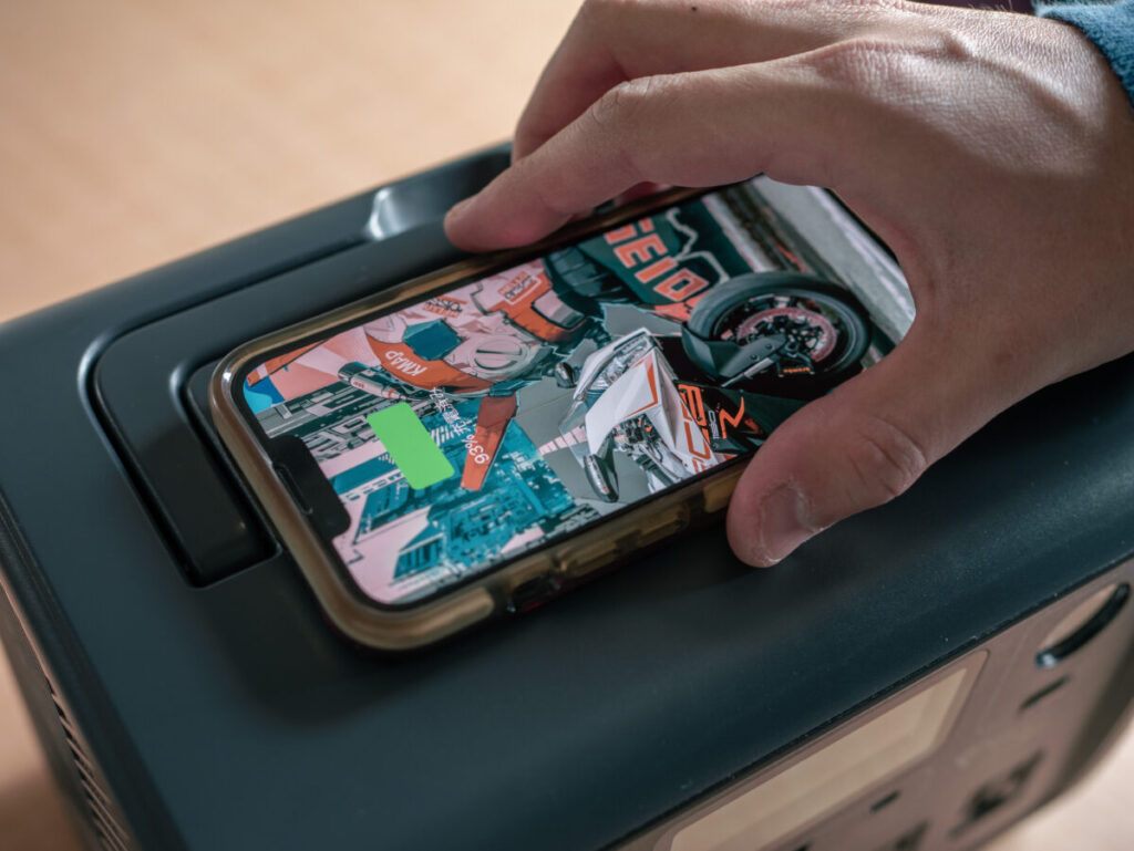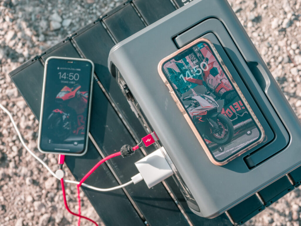 そんなところに今回EB3Aを実際に使用してみると、バイクでも持ち出しやすいコンパクトなサイズ(幅255mm × 高さ180mm × 奥行き183mm)はキャンプツーリング時にも一般的なツーリングバッグなら入りそうなサイズ感で、外部への出力についてもAC出力 100V(600W)の他に12V(10A)出力やシガーソケット出力に加えて、USB-A出力 5V(3A)やUSB-C(100W)など、多彩な電源出力が可能となっているのもありがたい。また、本体上部にはワイヤレス充電(15W)も用意されているため、対応するデバイスならケーブルを用意する必要もなく、複数のデバイスへ同時に給電できるのもポイントだ。