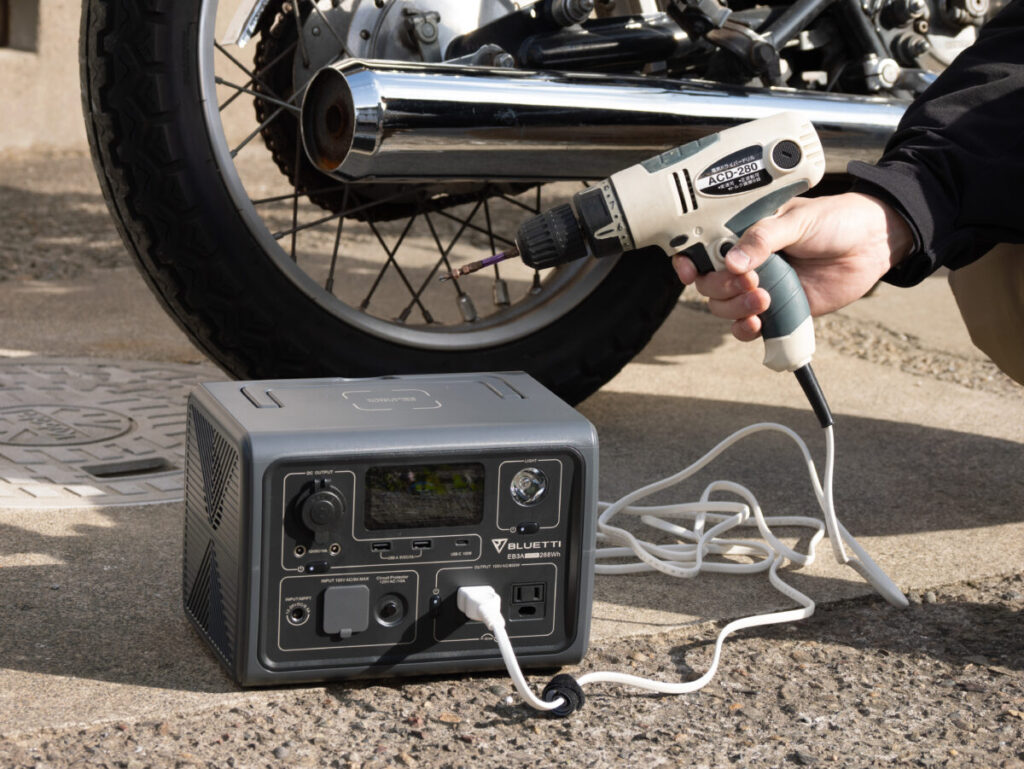 EB3Aのある生活をしていると、電源のない自宅屋外や出先でも電源が使えるメリットというのは非常に大きく、出力も100V(600W)まで使う事ができるので、生活家電はもちろんのこと、自分で愛車をメンテナンスするライダーにとっては、どこでも手軽に電動工具が使えるというのは想像以上に便利。