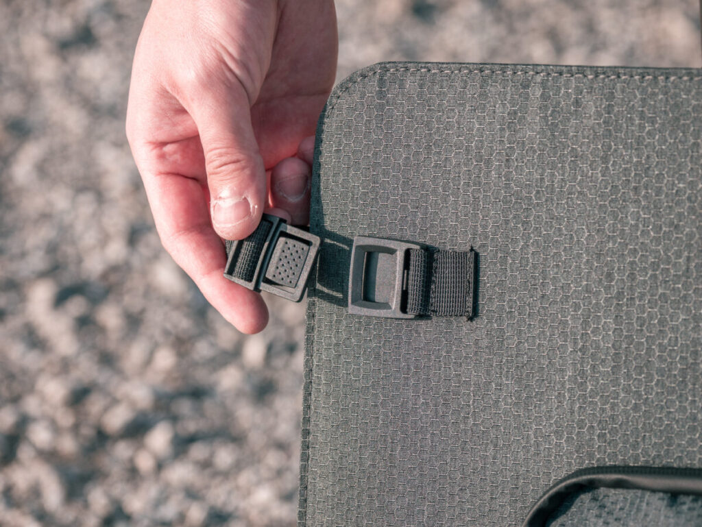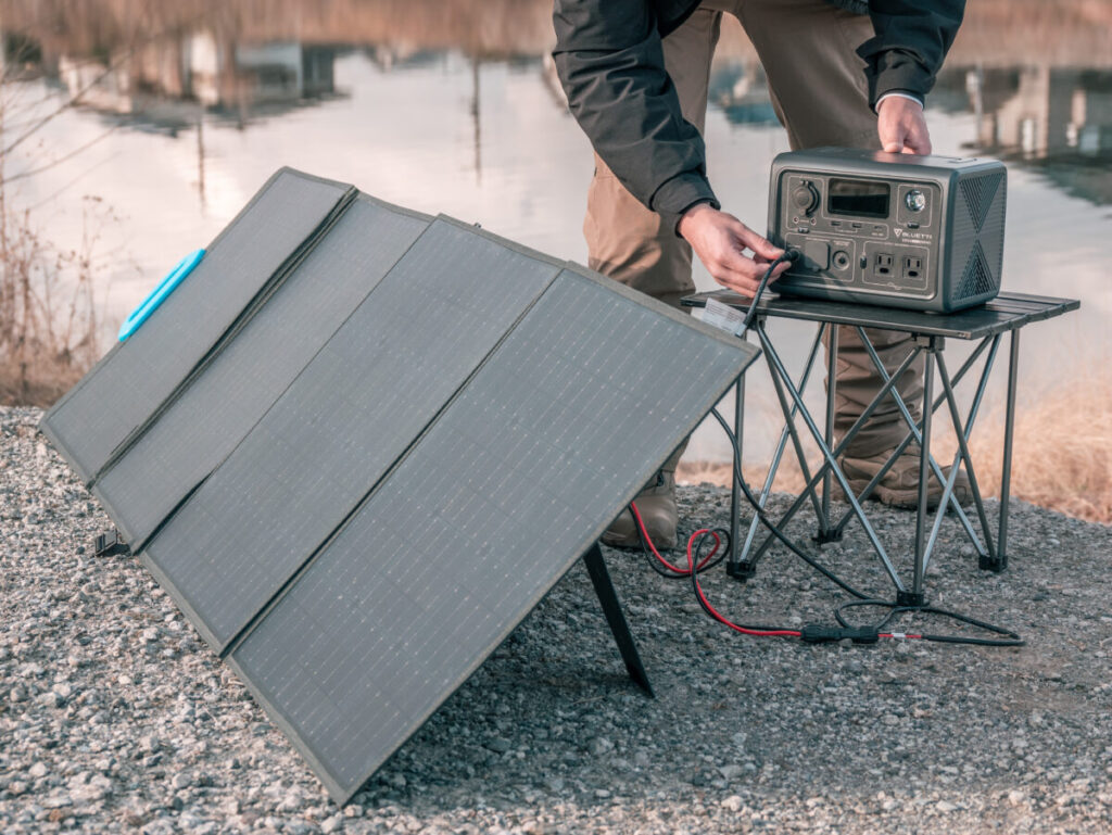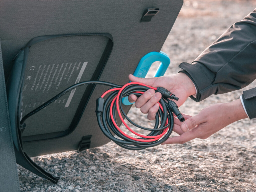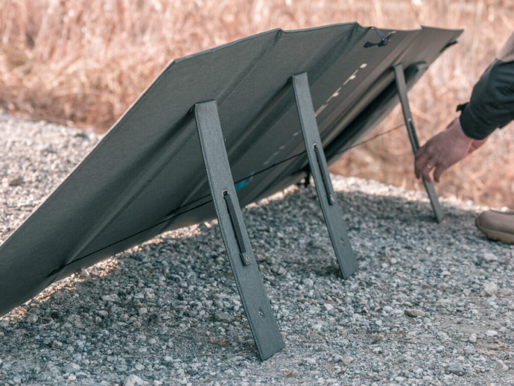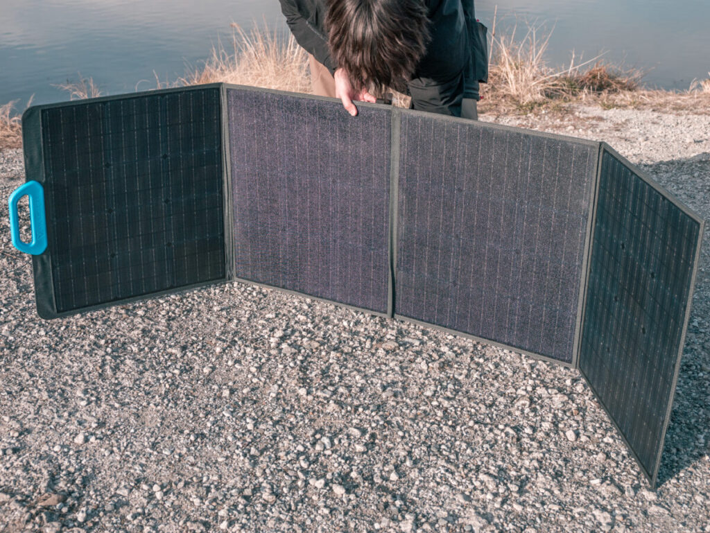 さらに、日光が当たる屋外で使用する場合は別売りとなっているBLUETTI / PV200ソーラーパネルを使って本体を充電することも可能。ソーラーパネルと聞くと非常に重たく、設置や接続も少し大変そうなイメージをしていたのだが、こちらのソーラーパネルは非常にお手軽。まずは折り畳まれたパネルを展開して、パネル背面に設置されたベルトで陽の向きに合わせて角度を調整するだけで設置は完了。あとはパネルのポケットに装備されたケーブルを使い、本体とパネルを接続するだけで充電が開始されるので、慣れてしまえばここまで5分とかからずに設置できそうだ。