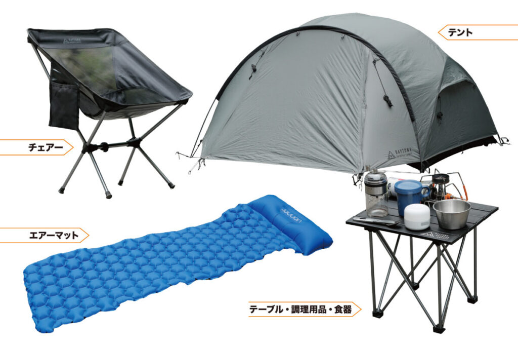 電気もガスも屋根もない、開放的な自然の中で行うキャンプでは寝床となるテントや調理をするためのバーナー、チェアーやテーブルなども必要になってくるだろう。さらに快適さを求めるなら寝袋やマット、日除けとなるタープも欲しいところである。