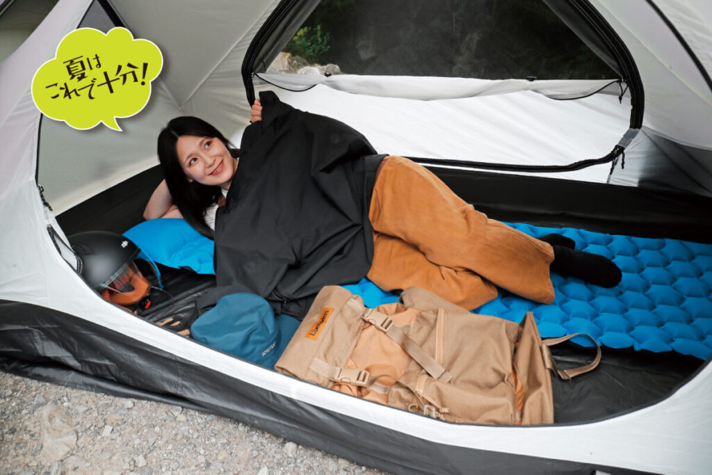テントの中にエアーマットだけという心許ない装備だが、気温の高い夏場なら上着だけでも眠ることは十分可能。ただし、標高の高い山中や雨に濡れた衣服では寝ている間に気温が下がったり、体温を奪われてしまうこともあるので注意しよう。レインウェアが一着あれば雨天時だけでなく、肌寒い時には防寒着にもなるので、持っていける余裕がある場合はぜひ持っていきたいアイテムだ。