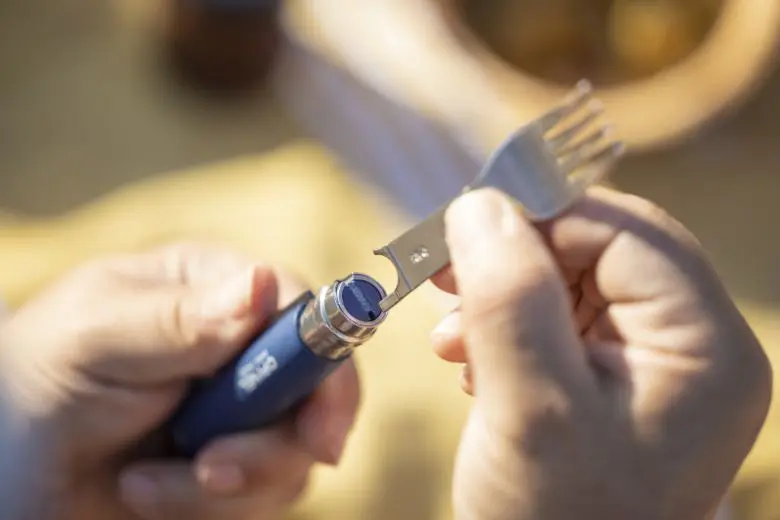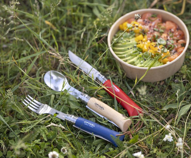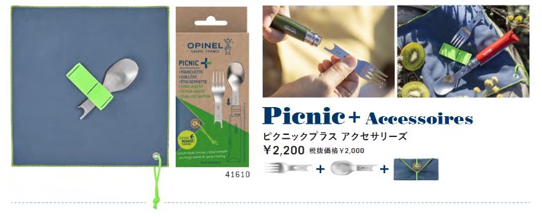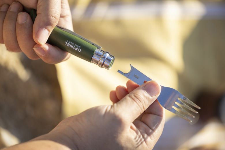 アウトドアの定番アイテム、オピネルのナイフNo.8のハンドルに取り付けられる、フォークとスプーンのオプションパーツ『ピクニックプラス』が登場した。