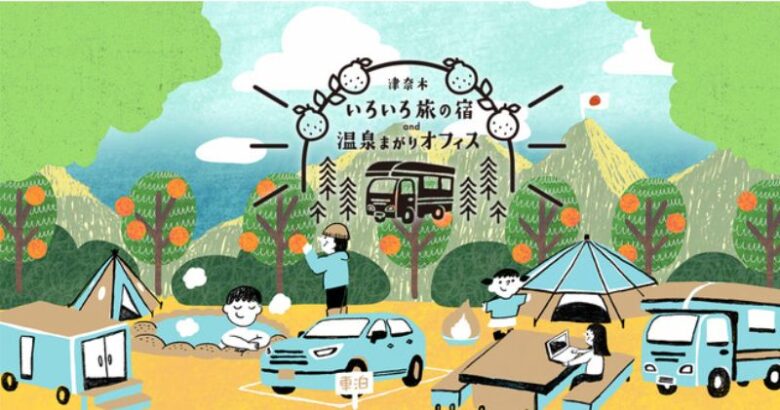 「津奈木いろいろ旅の宿and温泉まがりオフィス」は、津奈木町役場が主体となり、津奈木町の中心部にある温泉施設「つなぎ温泉四季彩」や、物産館「つなぎ百貨堂」の広場を活用して実施する、宿泊とワーケーションの実証事業である。