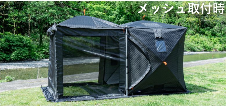 テントサウナをしたあと、そのままキャンプができる。サウナが終わったあとにテントの一面を跳ね上げ、ポールで固定することにより、そこが屋根となってキャンプのベース基地になる。つまり、タープ代わりになる。さらに付属の蚊帳を取り付ければ、広々とした奥行きのあるテントに。グランドシートを敷いたり、コット(アウトドアベッド)を置くことで、そのまま宿泊も可能である。テントサウナをするとき、自然のなかの気持ちいい場所を探すだろう。せっかく見つけた場所なのだから、サウナ後そのまま余韻に浸ってほしくて、この機能を備えた。