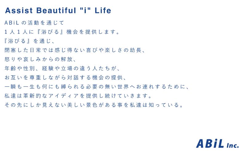 これからの世の中で、サウナがもたらしてくれるポジティブな影響を僕たちABiLからも発信し、皆さんに『浴びる』機会を、『Assist Beautiful “i” Life 』の世界観を拡げていきたいと思いこのプロジェクトに臨む!