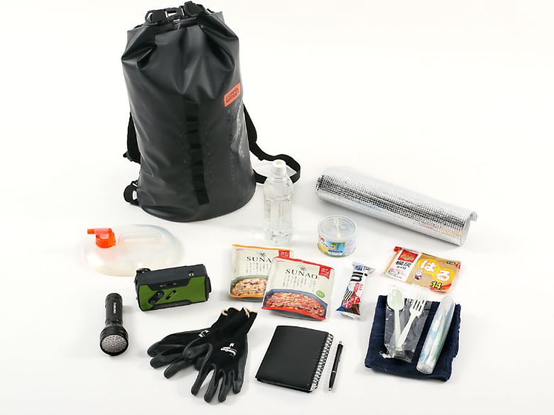 「防水」の非常用持ち出し袋として防災グッズをつめておけば、豪雨でも水から中身を守ってくれる。またリュックタイプなので緊急避難時にも両手を開けておくことができる。