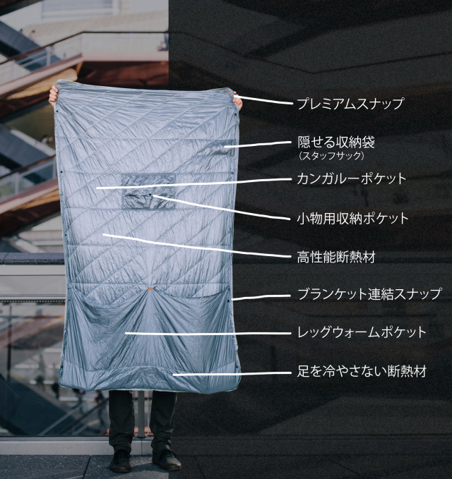 300gと超軽量で、手のひらで持ち運べるサイズのブランケットはキャンプツーリングにピッタリ。
