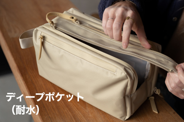 耐水ポケットなので、仮に液体が漏れてもポケットの外のアイテムが濡れるのを防いでくれる。