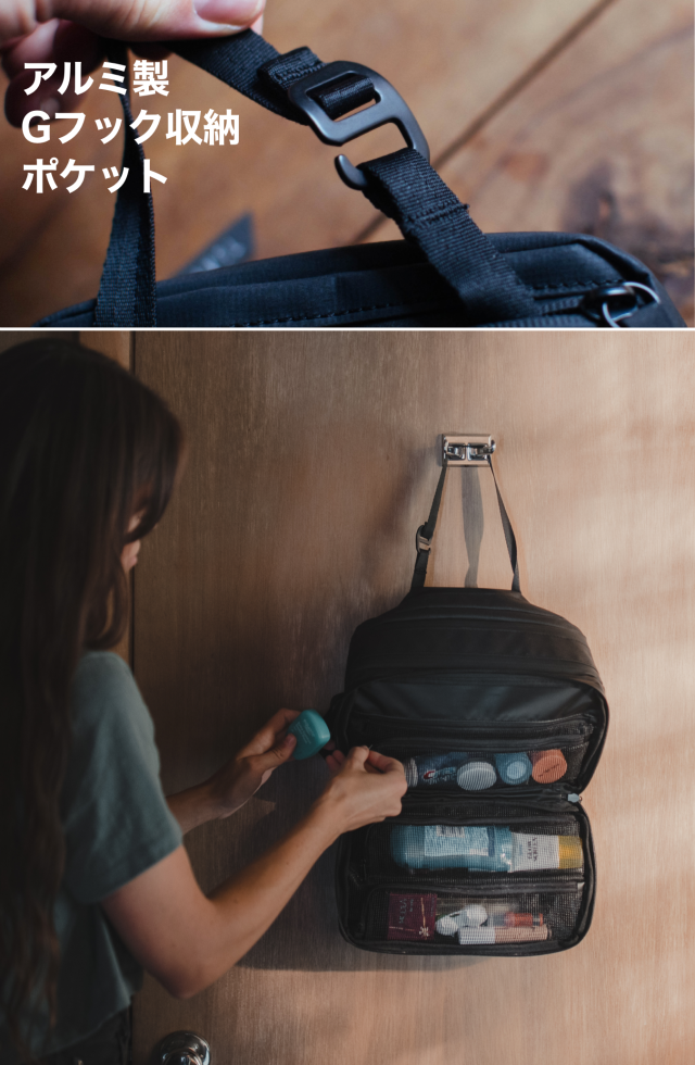 本体の専用ポケットに収納されているストラップ&Gフックを使えば、キャンプ先で木などにポーチを吊るすことができる。