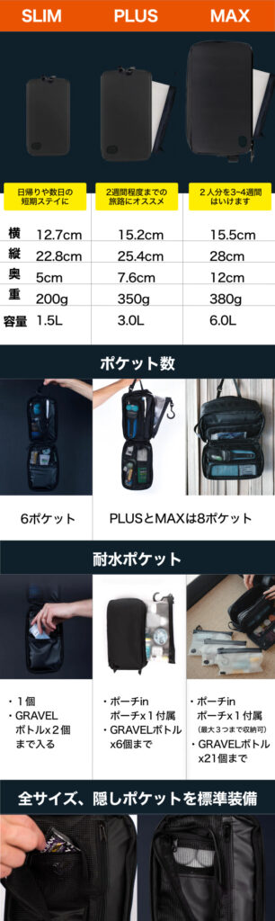 GRAVELの由来は旅を始める時、車のタイヤと砂利が起こす摩擦の音からきている。新しい冒険が始まる瞬間、それが同社のブランドGRAVEL=砂利(じゃり)に込めた想いだ。旅をする全ての人にとって、かけがえのない時間を共に過ごすパートナーになりたい。その想いに恥じることがないようにコツコツと3年越しに続けてきた一番の人気商品『トラベルポーチ』。新サイズ&カラー展開で、満を持しての日本国内での販売となった。