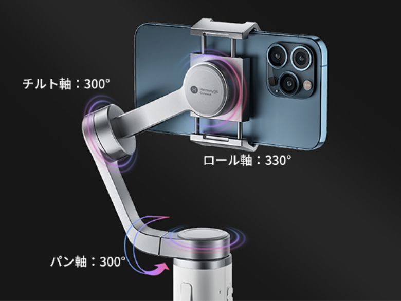 チルト軸がロックされ、スマホはロール軸の上下の動きと、パン軸の左右の動きに合わせて常に動き、安定した滑らかな映像を可能にする。