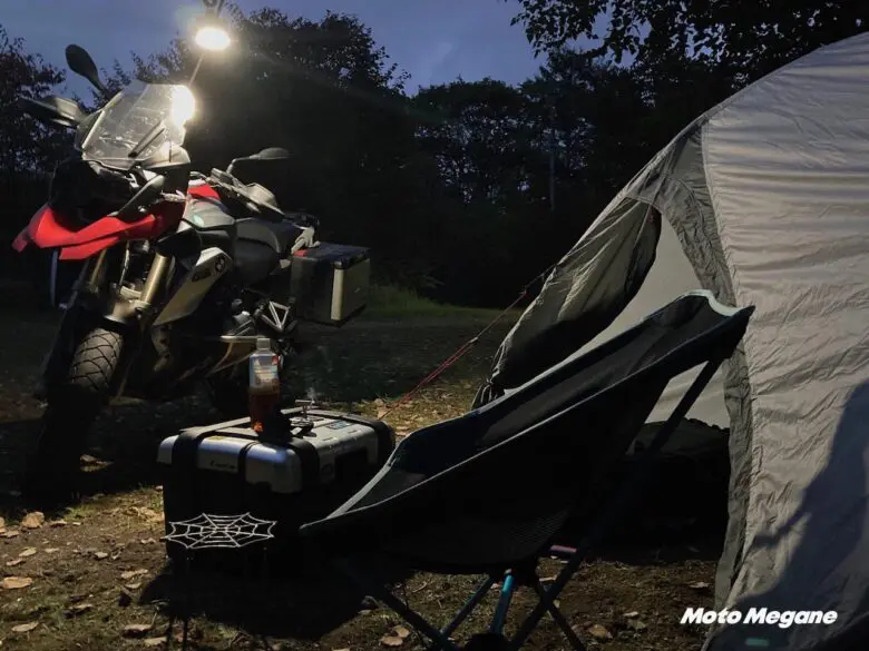 今回は妻と2人のツーリングでしたが、2人分のキャンプスペースを照らすには必要十分な明るさでした!