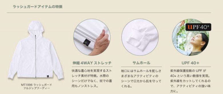 ラッシュガード素材をフルジップフーディーやTシャツなどに採用。水辺でのアクティビティにも最適。UPF40+で紫外線から保護する。