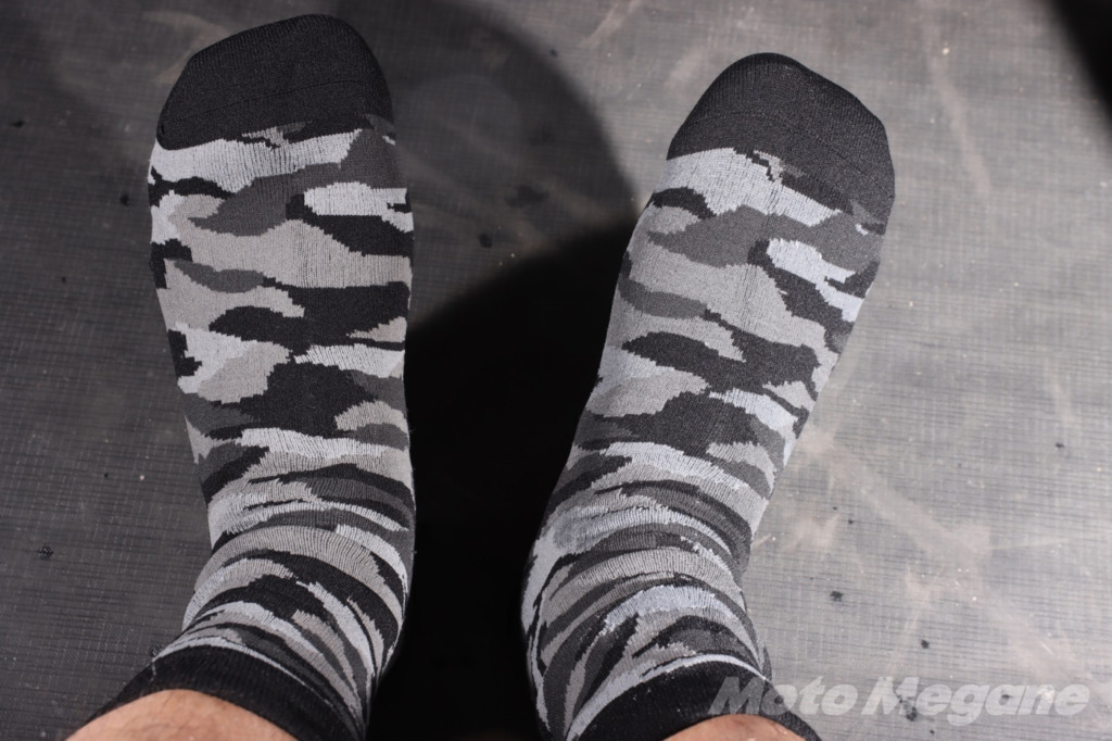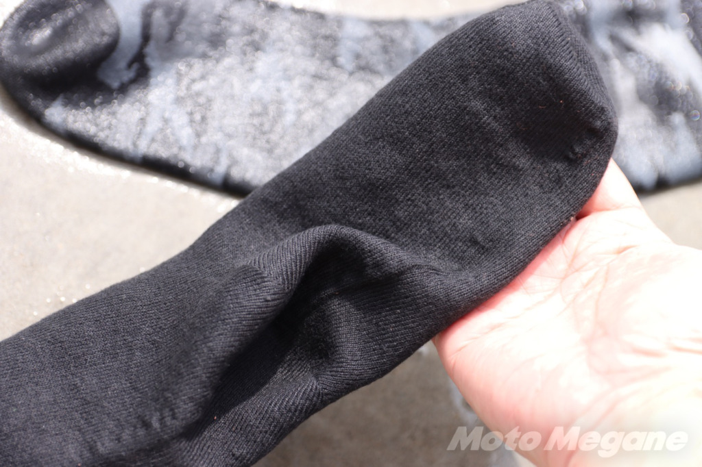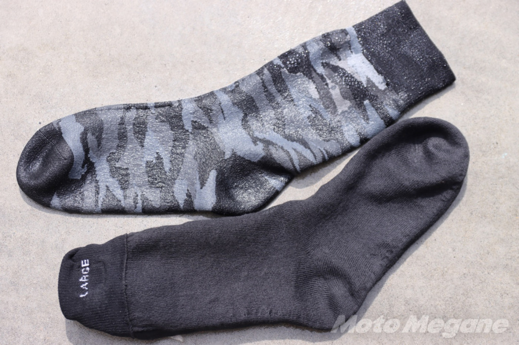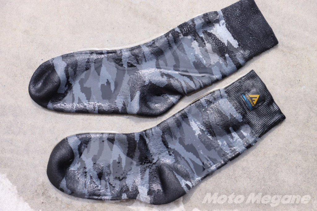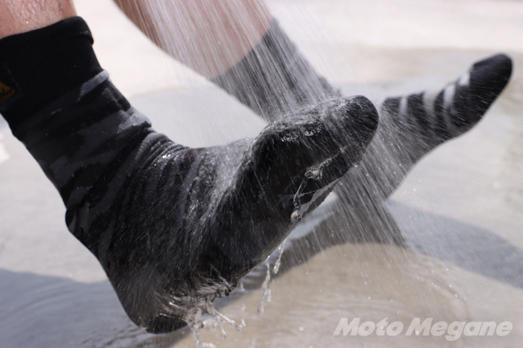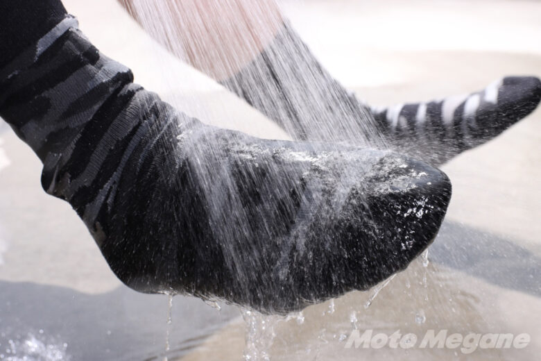 バイクに乗る時はあらかじめこの靴下を着用しておけば、ひとまずレインウェアだけ携行しておけば、惨めで不快な靴の水没を防ぐ事ができるのではないだろうか!