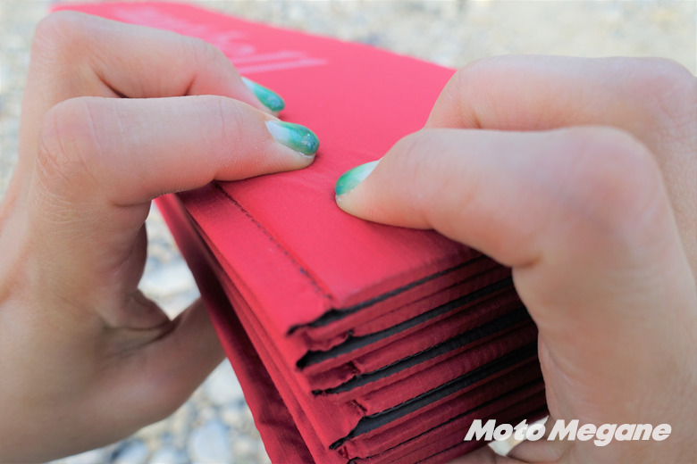 対して表・赤い面には、クッション性を確保するポリエチレンフォームが使われており、薄いながらも指でギュッと押すと多少のへこみが感じられる。