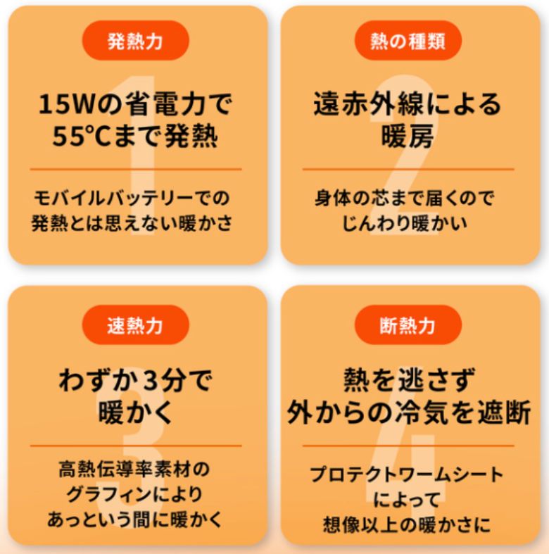 発熱性能と操作性について絶えず研究を重ねた結果、”5V”というモバイルバッテリーでも十分な低電力で寒い屋外環境でも、まるで自宅で使うホットカーペットや電気毛布のような暖かを感じて頂くまでになった。