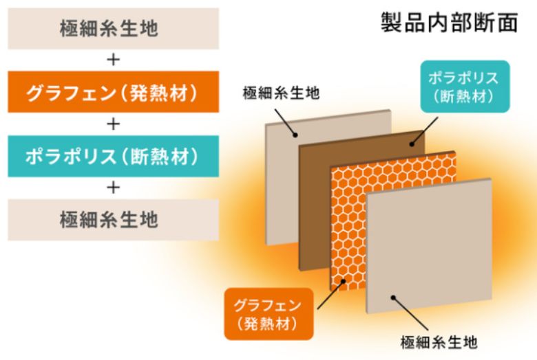 グラフェンは炭素素材の一種で「銅の10倍」という高い伝導率を持つことから奇跡の素材と言われている。さらに、芯からじんわり暖かくなる遠赤外線効果も期待でき暖房用品期待の素材である。