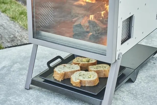 焚き火の最中に薪が爆ぜたり、火の粉が飛ぶことがある。しかし、耐熱ガラスの窓があることで、炎のゆらめきを楽しみつつ、それらが飛散するの防ぐことができる。