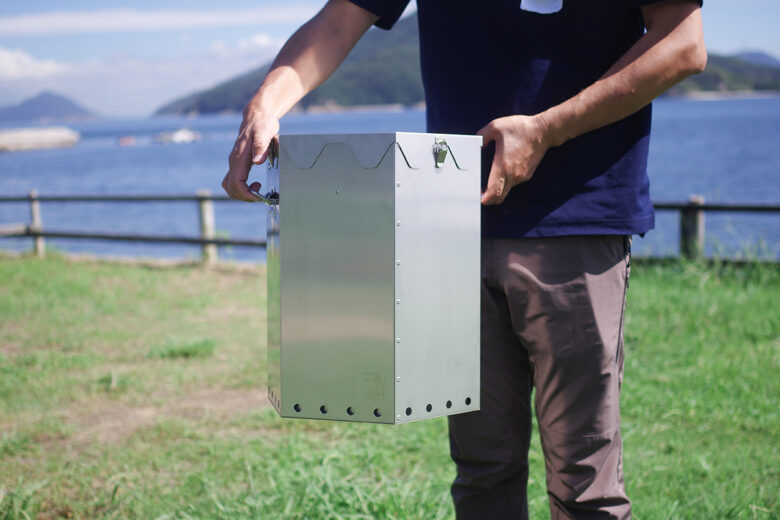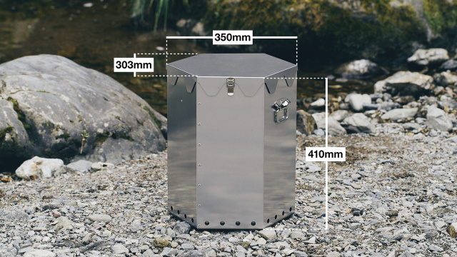 ヘキサウッドストーブを構成するパーツは、本体とフタ兼遮熱板、五徳の3つだけ。使用状態までのセットアップはとにかく簡単。焚き火を撤収する時も、灰が地面に落ちない構造なので、本体を逆さまにして灰を処分するだけ。ステンレス製のボディなのでサビにくく、汚れが気になったら水洗いも気軽にできるのだ。