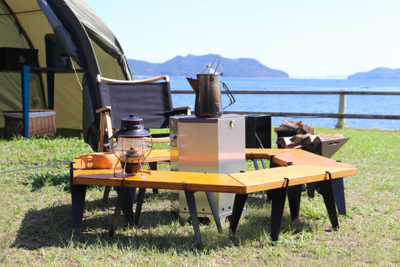 中央部が空いたテーブルは「ヘキサウッドストーブ」と相性抜群! それでいて、手持ちの焚き火台やウッドストーブ、BBQグリルをテーブルの中心に置ける、汎用性の高い作りとなっている。テーブルの高さは23.5cmで、ロースタイルのチェアに腰掛けた時に使いやすく設計されている