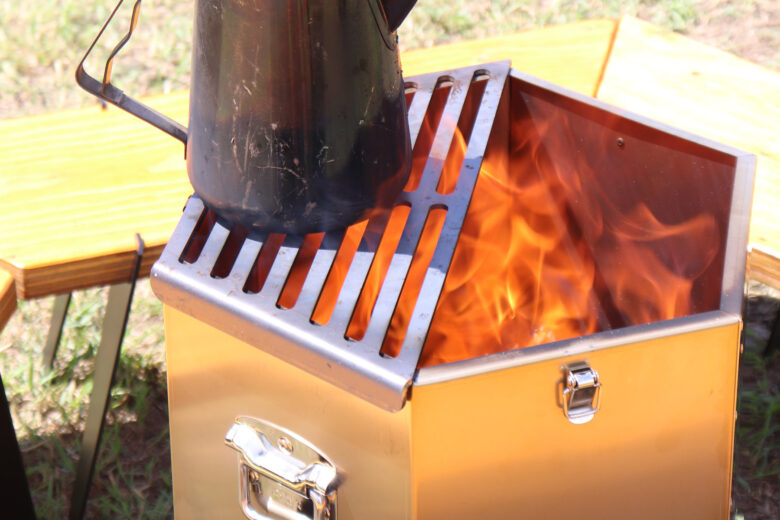 ストーブが二重構造になっていることで、効率的な燃焼を促して二次燃焼を実現。煙の発生が一般的な焚き火台よりもはるかに少ないのだ。