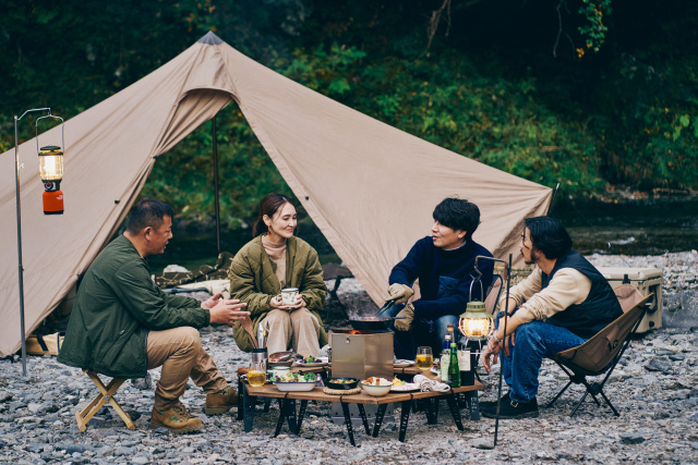 ストーブ、テーブルが共に六角形なのは、ストーブから程よい距離を保ちつつ、個人のスペースをを確保して仲間と火を囲みやすいから。さらにテーブルに関しては、コンパクトにまとめやすいという理由もある。