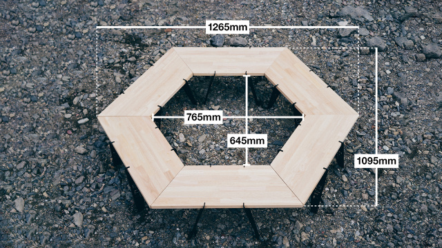 「ヘキサウッドテーブル」はヘキサウッドストーブを囲うように6つの自立型テーブルをドッキングさせて使うというもの。単体でも使えるのでソロキャンから、仲間とワイワイ火を囲むキャンプまで幅広く対応する。