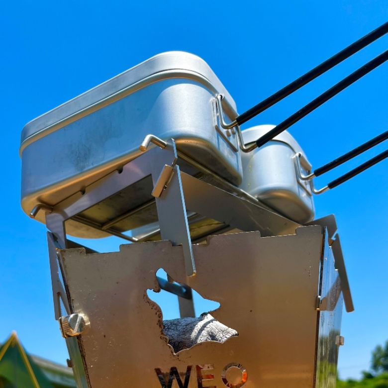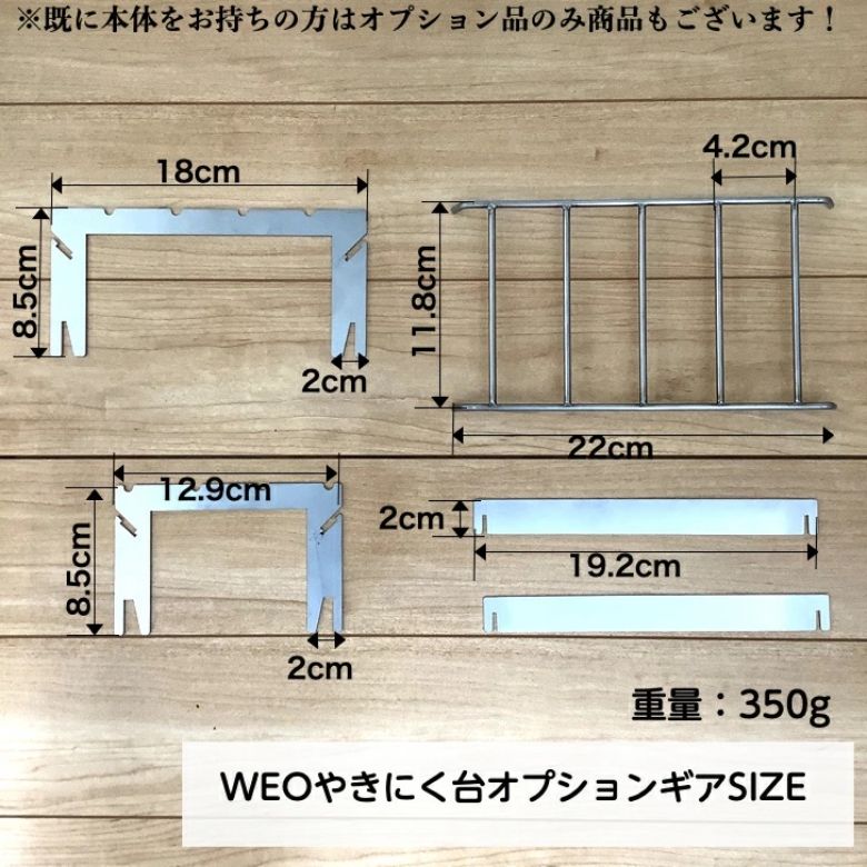 「ホタテ用焚き火台よりワンサイズ大きな本格ソロキャン用焚き火台が欲しい」という声から生まれた第二弾「WEO やきにく用焚火台」製品。今回は、さらに第二弾製品にプラスαで機能性を追求した高品質のオプションギア製品である。