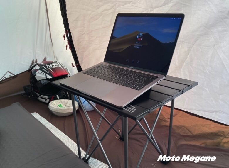 ご飯を食べるのにも丁度いい高さですし、テント内PCも快適ですし、後で紹介する焚き火台を置くにもピッタリな高さとなっております。