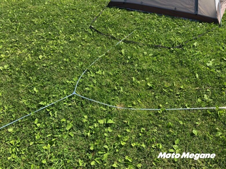 最後は準備ペグを打って固定して、ロープで張りを調整すればこれにてテントが完成となります!