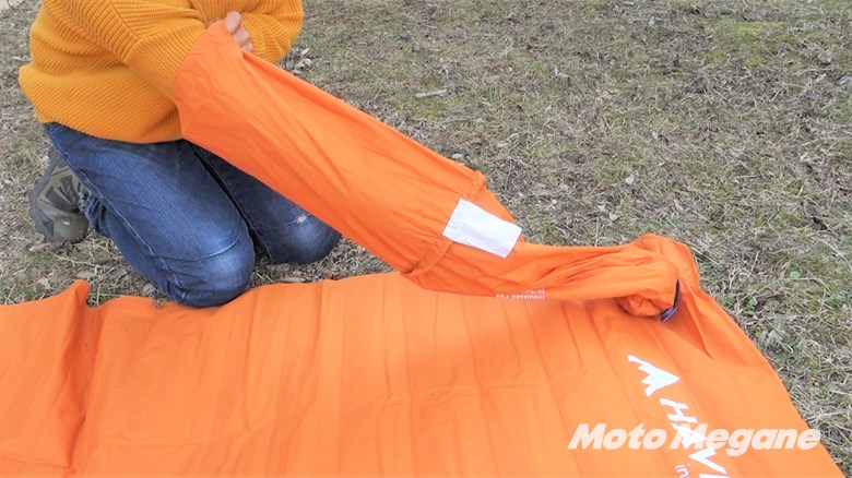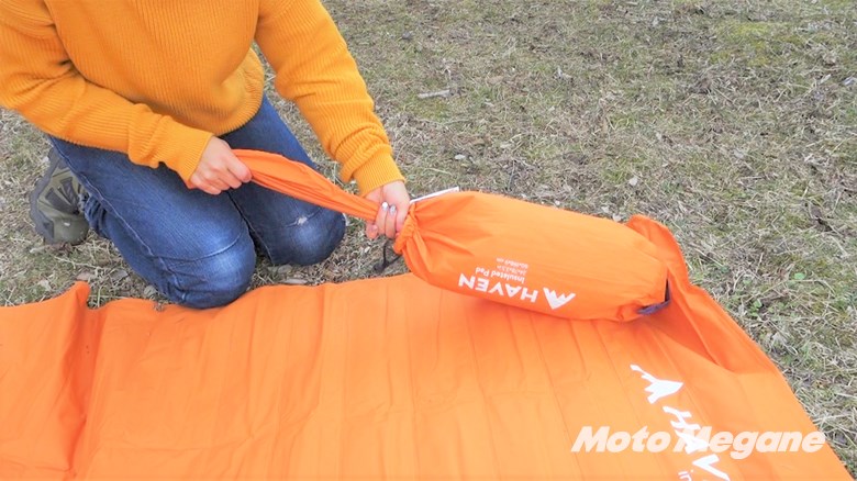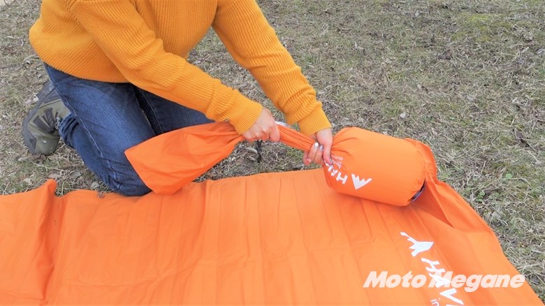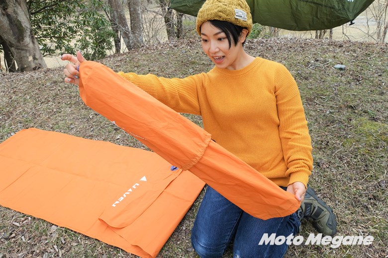 公式の動画によると、ハンモック上で空気を抜きながら巻くことで、接地せずに収納することができるそうです。