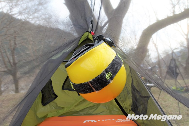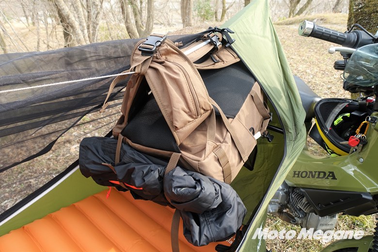 そんな時はヘブンテントの下にシートを敷き、パニアを丸ごと降ろすのがオススメ。テントの中からすべての荷物にアクセスすることができて便利ですよ。