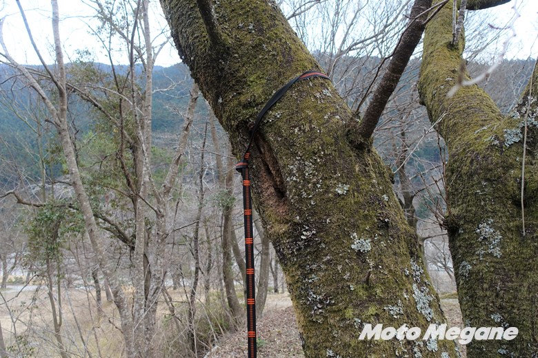 ツリーストラップを木に巻き付け、写真のように固定します。これをもう1本の木に対しても行います。