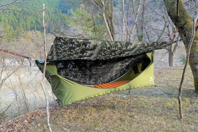 テントのように床が平ら&ハンモックのようにどこでも寝られるという、テントとハンモックの良いとこ取りをしたアイテムです。