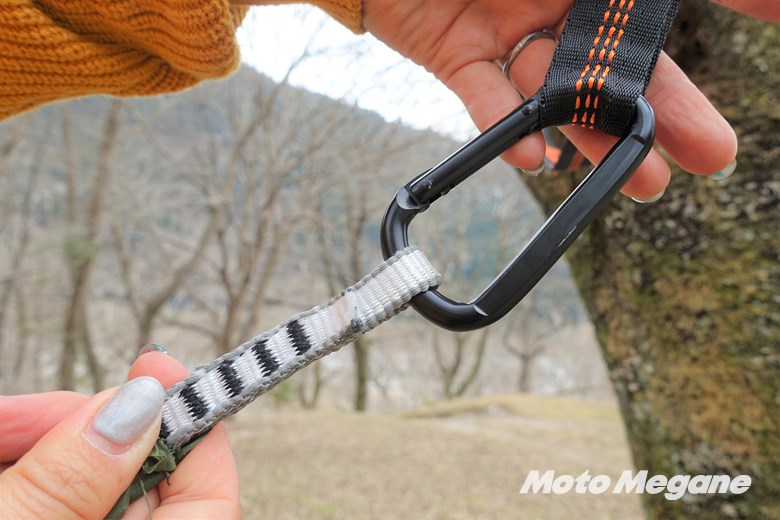 本体の両端には、カラビナを引っかけるためのフープが取り付けてあるので……