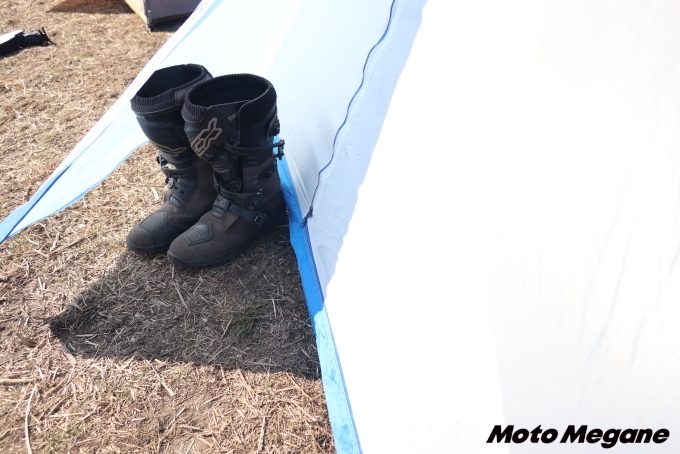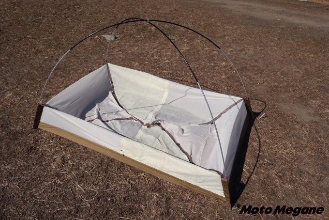 キャンプツーリングは荷物を極力抑えたとしても、ヘルメット、バッグ、ブーツといった比較的大きなギア類は削りようがない必須の装備だ。そこで前室があればブーツや濡れても大丈夫な荷物を置くことができる。広ければ広いだけ便利ではあるが、その分テントの重さや収納時のサイズに影響する。また前室にフレームが必要なテントだと、設営や撤収にも時間を要してしまう。HCSの二つのテントは絶妙な前室のサイズとなっており、荷物を置くことができつつも、テントの重さや収納サイズも十分考慮されている。