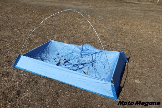 フライシートがない分、設営はさらに簡単! テントを地面に広げ四隅をペグダウン。その後にフレームを組み立て、そこにテントを吊り下げれば完成。設営工程はよりシンプルだ。テントの設営&撤収何よりも早く済ませたい人におすすめだ。