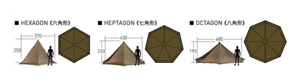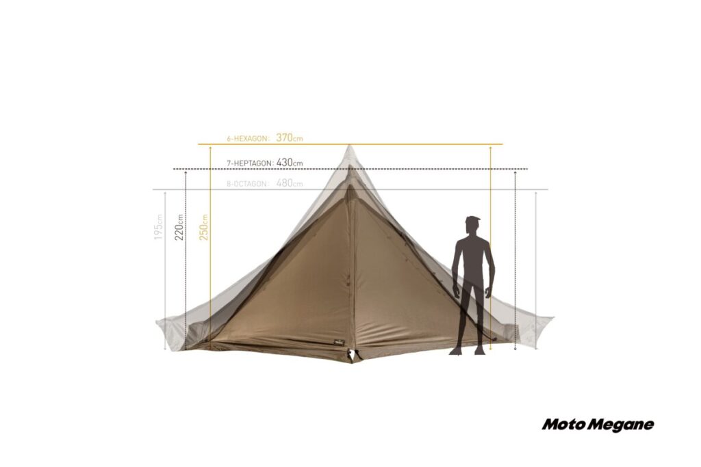 一般的なテントは立てた形が決まっているものだが、この『タッソ』はワンポールテントという形状は維持しつつも、六角形、七角形、八角形と様々な張り方ができるのだ。