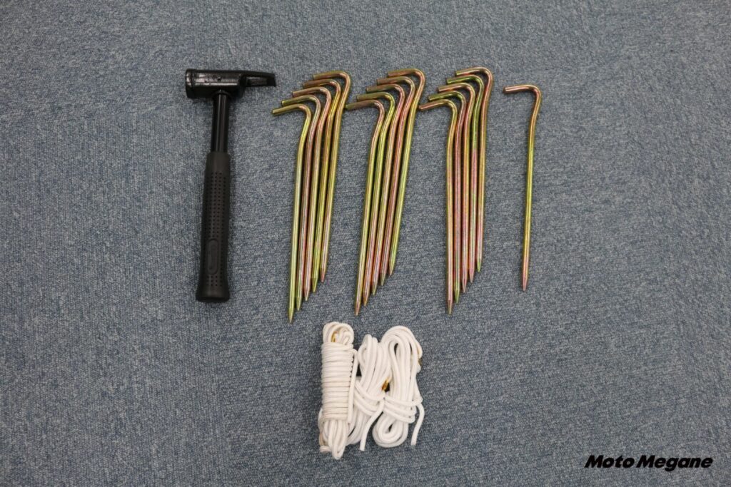 スチールピン25cm×16本、張り綱2m×7本・3.5m×1本、収納袋