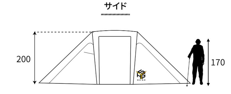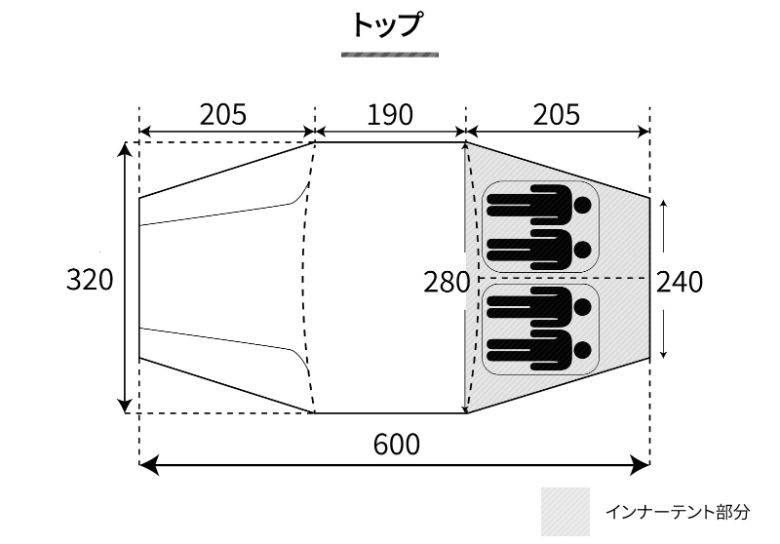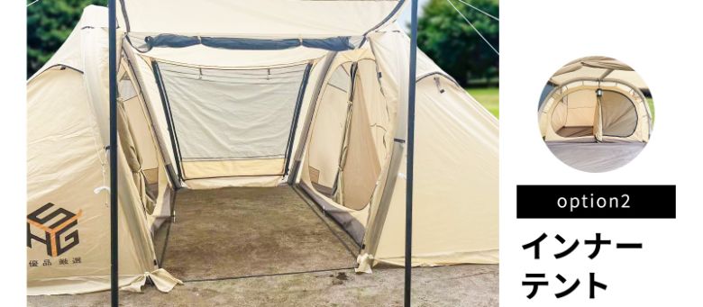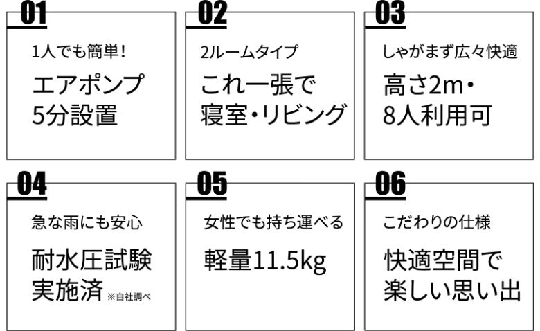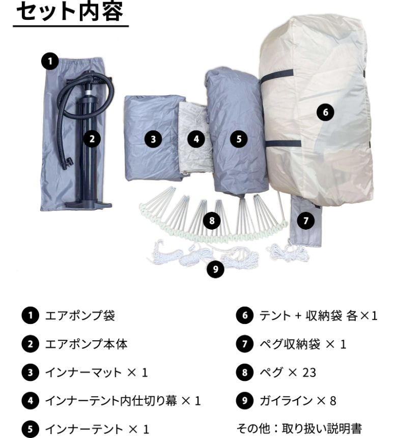 付属品:エアポンプ収納袋×1、エアポンプ×1、インナーマット×1、インナーテント内仕切り幕×1、インナーテント×1、収納袋×1、ペグ収納袋×1、夜光性テントペグ×23、ガイライン×8、取扱説明書×1