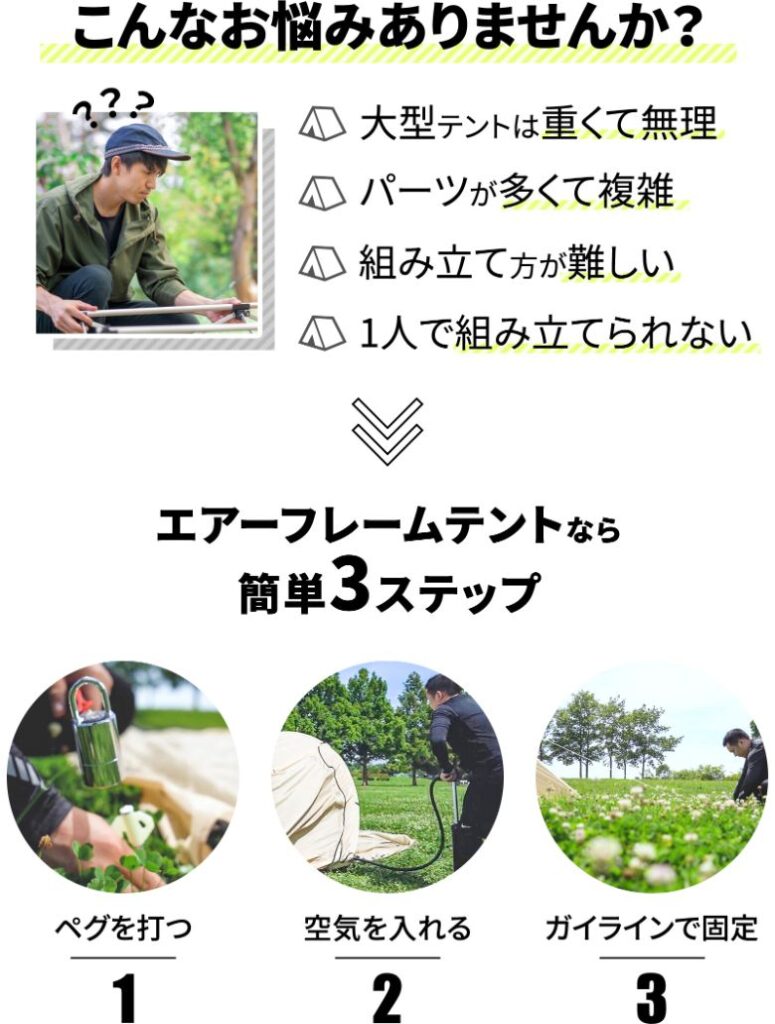 『優品厳選エアーフレーム大型テント』の簡単3ステップ