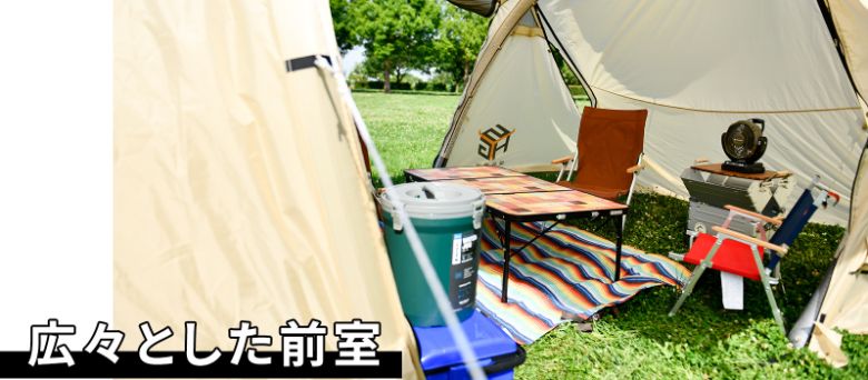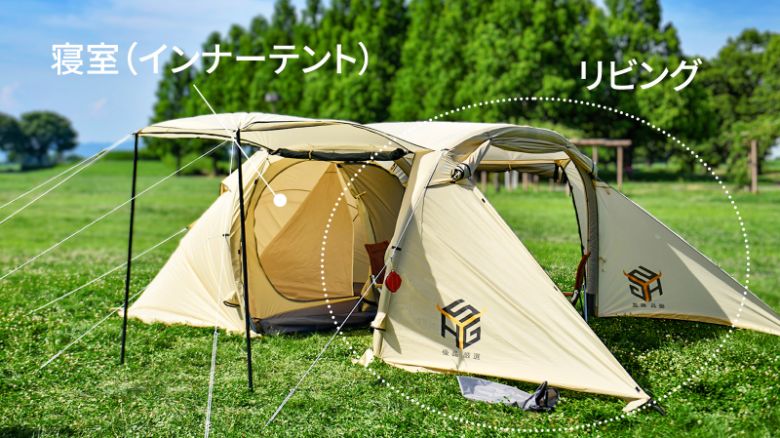 テント(寝室)とタープ(リビング)が一体となった2ルームテント!