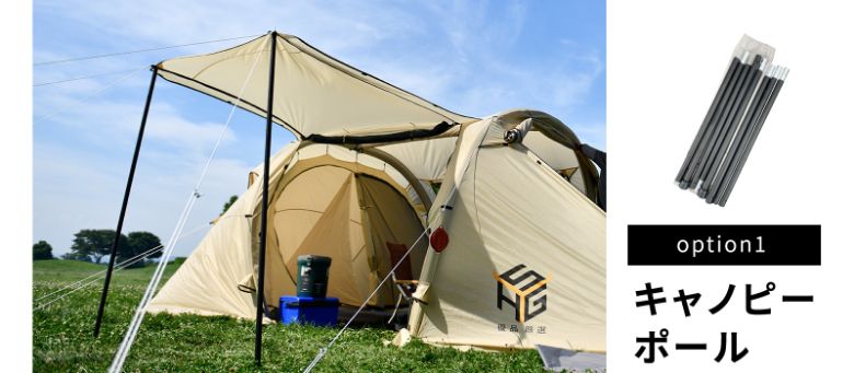 別途オプションのキャノピーポールを応援購入いただければ、日陰部分をさらに拡張して使用できる。