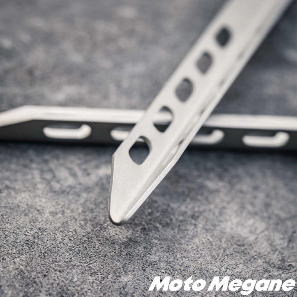 「Vチタンペグ」最大の特徴は、なんといってもその軽さ。素材に軽量で丈夫なチタンを採用し、さらに肉抜き加工が施されている。キャスティングペグの重量185gに比べてわずか11gと非常に軽量だ。
