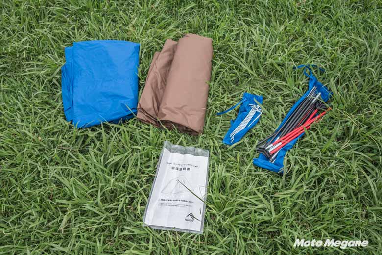 設営予定地で袋から取り出してみると、フライシート、テント本体、ペグ、ポール、説明書が出てきました。