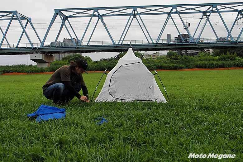 キャンプツーリングでの使い勝手はどうなのか?バイクに積み込んでテントを試し張りしてみました。