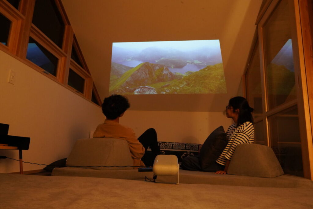 プロジェクターも設置しており、夜はマットレスに寝転びながら真っ白い天井をスクリーンにホームシアターもお楽しみいただけます。