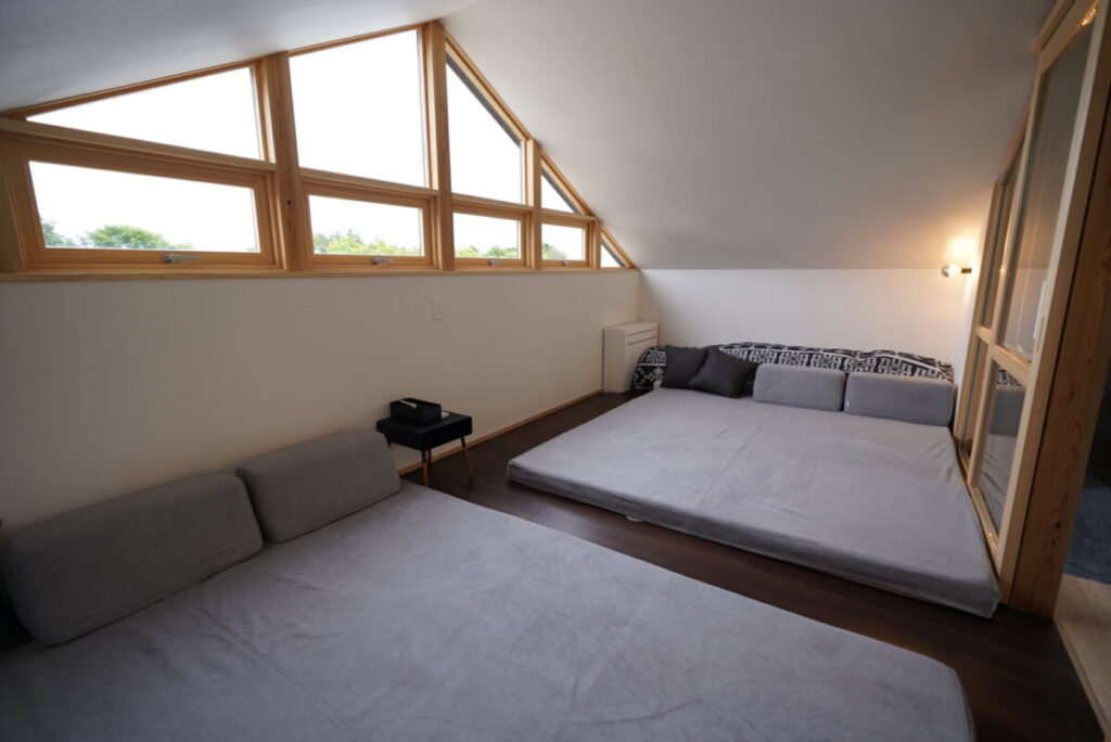 屋根裏のような2階は靴を脱いで過ごすリラックス空間。ローソファとしても使える特注マットレスが敷かれています。