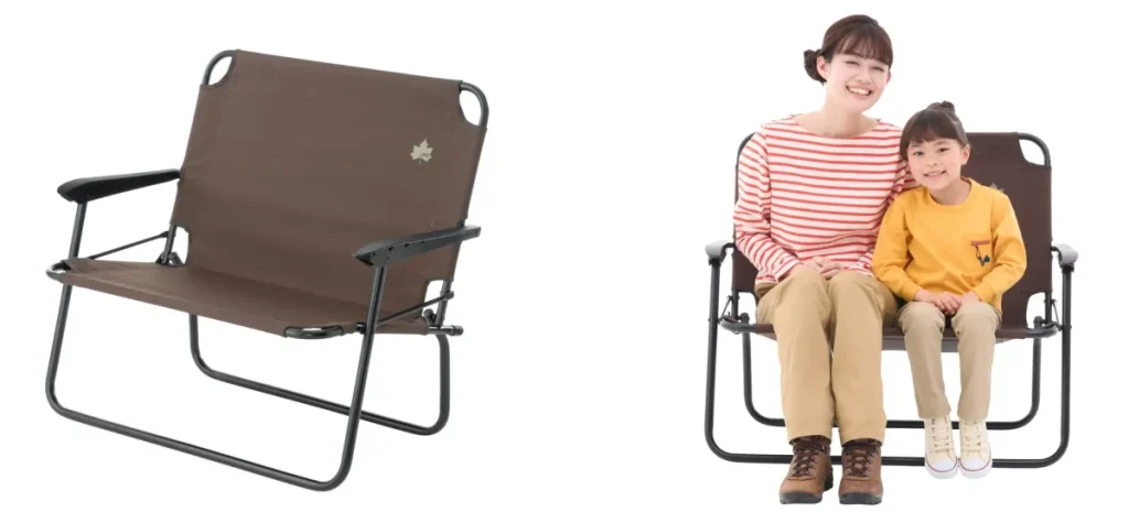 親子で座るのにちょうどいいサイズの折り畳みチェア。耐荷重120kgと丈夫で、1人の時は空いたスペースを荷物置きにできる。
